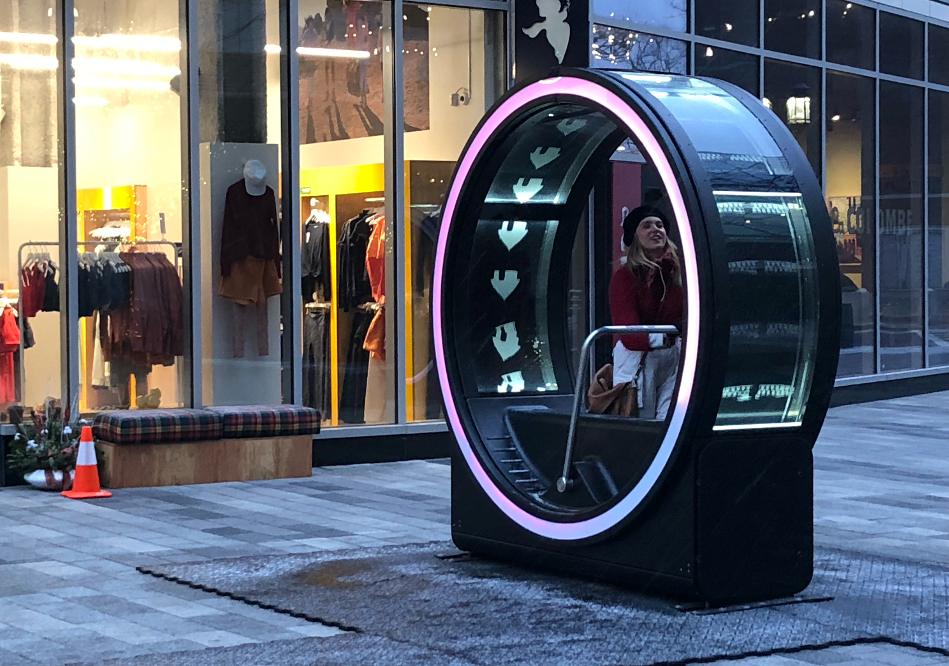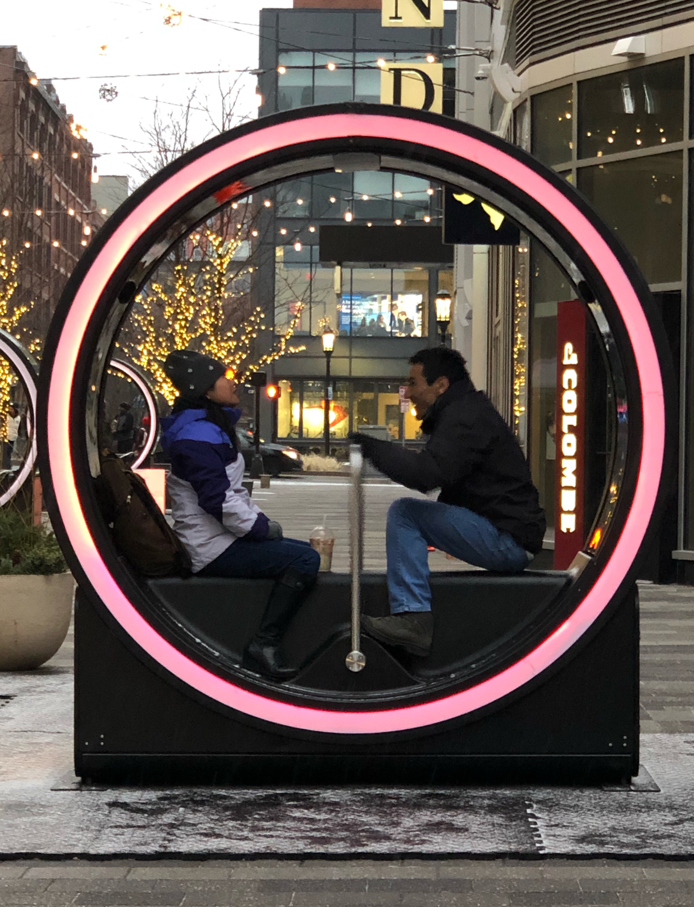 The viewers sit inside the cylinders and pump the lap bar, as the speed of the bar increased so does the tempo of the music and the lights, creating a truly immersive experience.